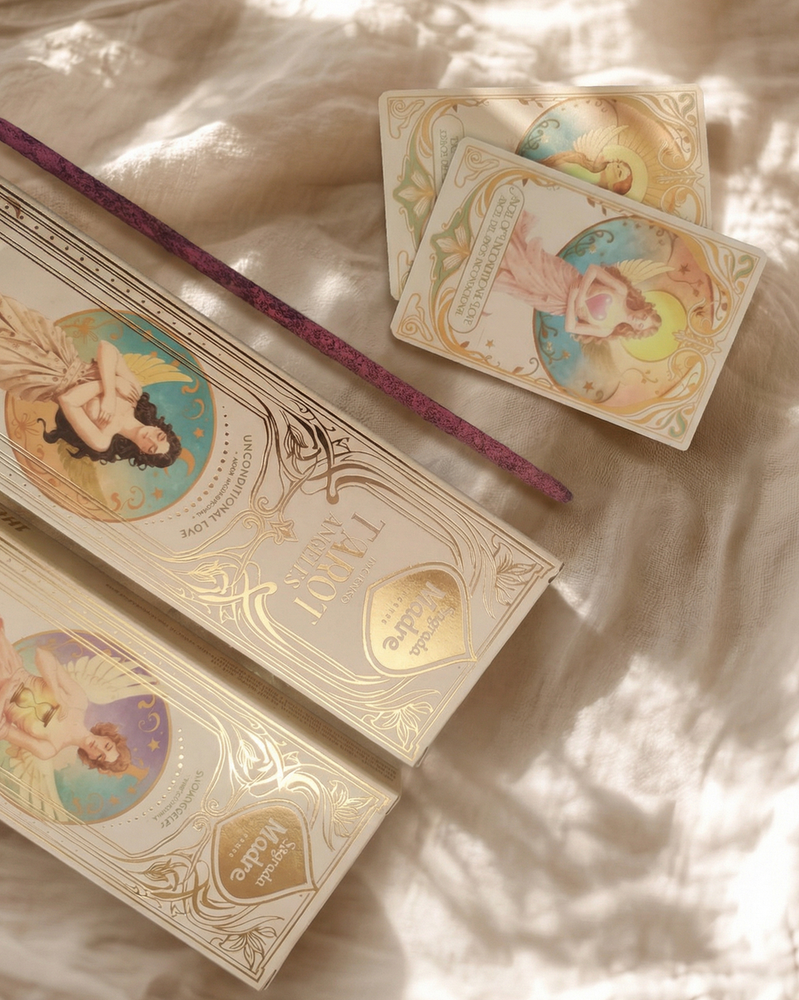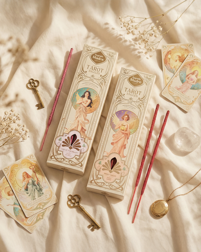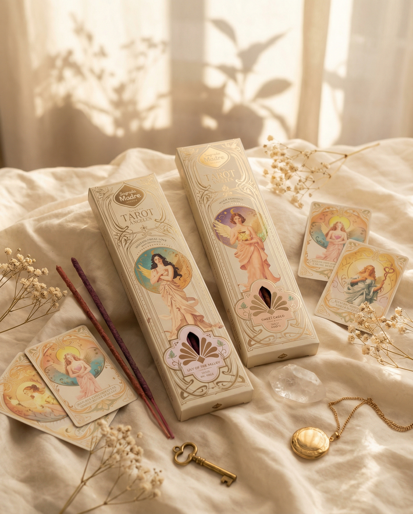 Cada caja contiene sahumerios con aroma exclusivo + 2 cartas troqueladas al azar pertenecientes a los 22 arcanos mayores coleccionables.
