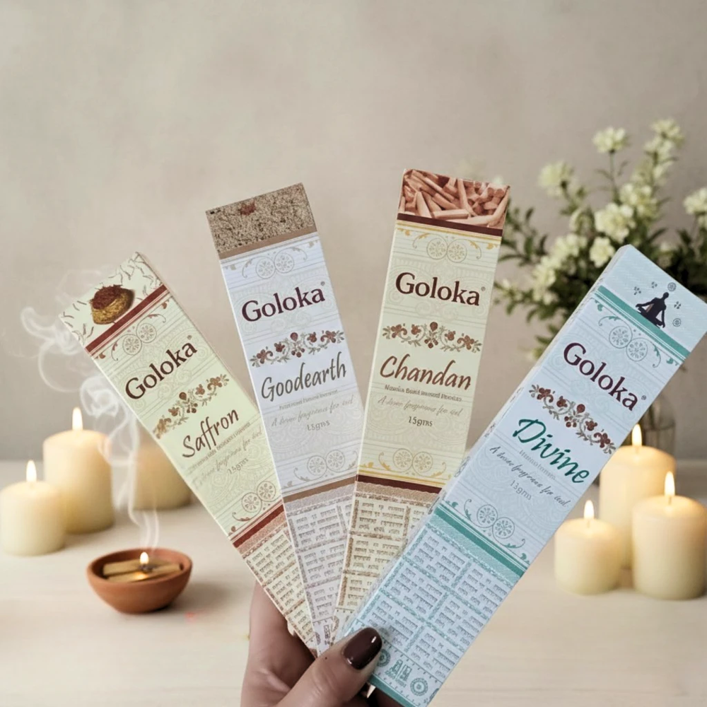 Especificaciones: • Marca: Goloka • Tipo: Sahumerio importado • Cantidad: 10 varillas aprox. • Duración: 40-60 minutos • Hecho en India